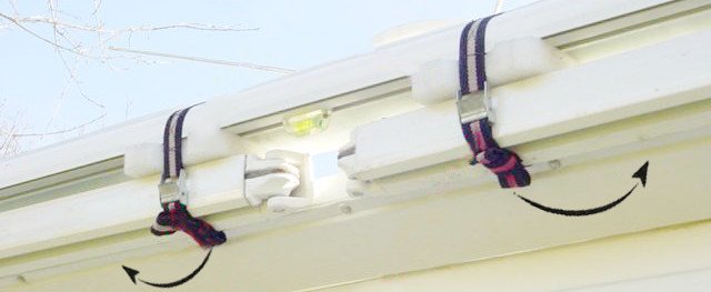 Sanglez les bras en enroulant vos sangles autour à plusieurs reprises comme illustré dans la photo ci-dessous. Puis, liez les bras au tube carré ou au coffre intégral de votre store en décrivant de nouvelles boucles tout autour.