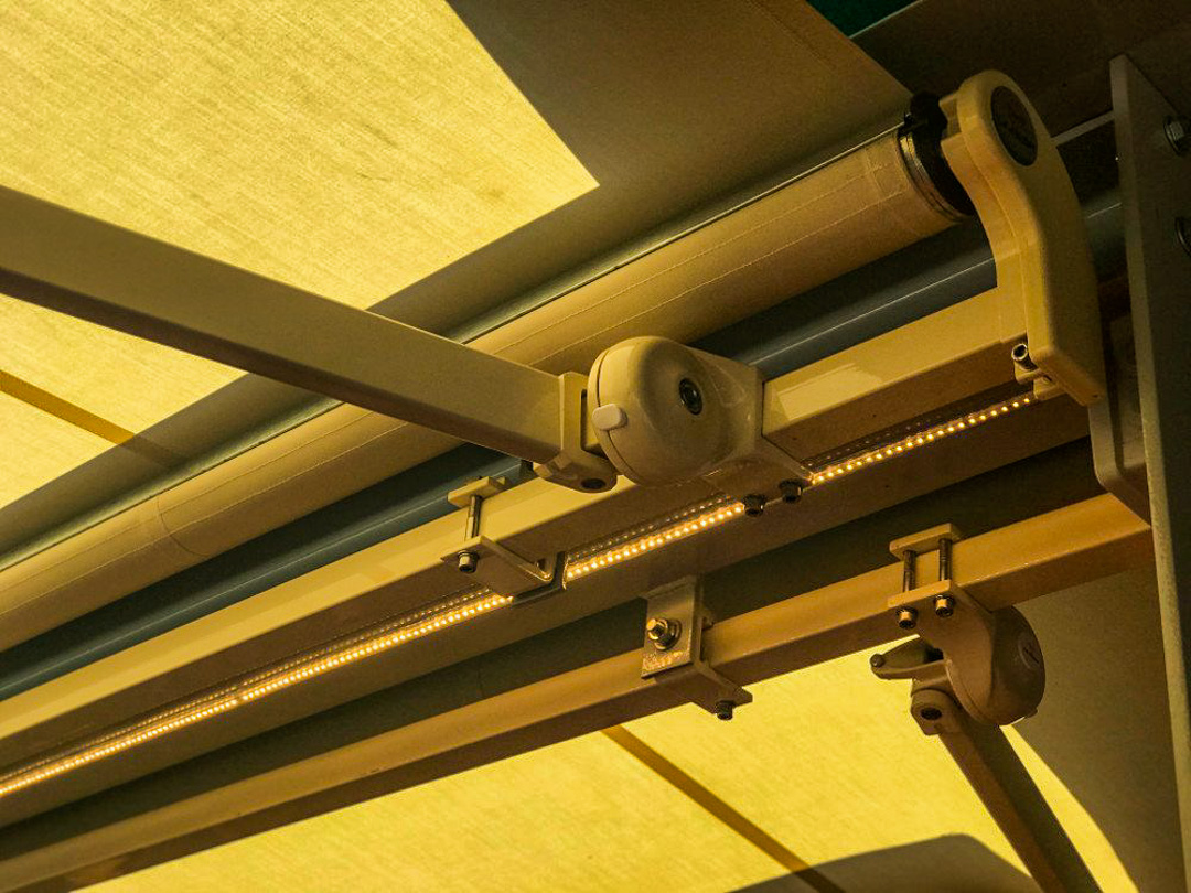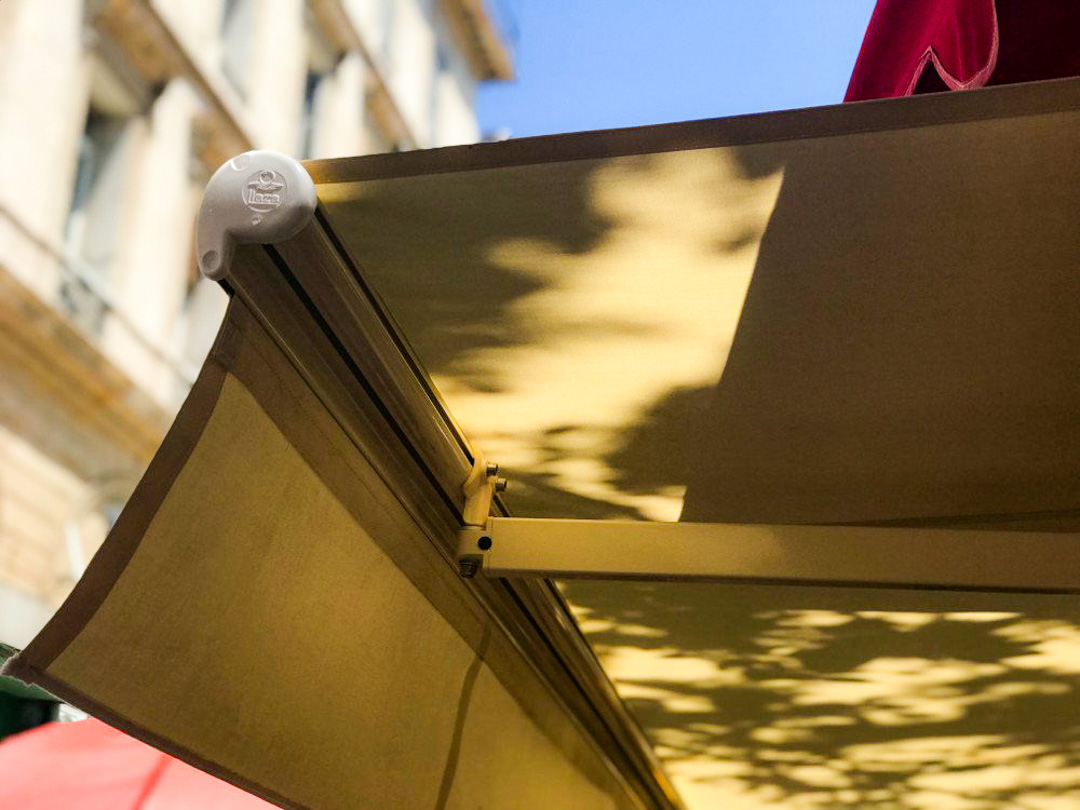 Répondant complètement aux contraintes d'installation sur les armatures métalliques prévues, les Art 350 se sont parfaitement adaptés dans cet espace, offrant l'ombre nécessaire aux étals tout en apportant de la luminosité grâce à leur toile Dickson claire référence ORC 7548 Ivoire.