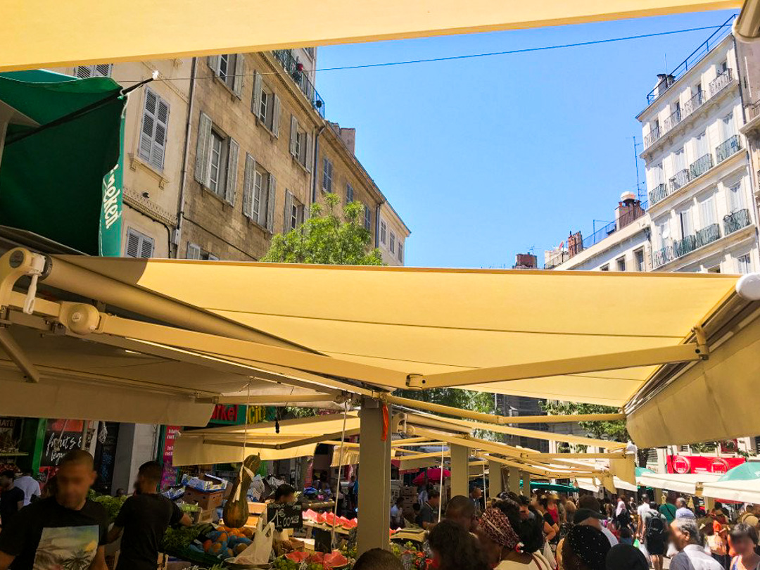 34 stores bannes monobloc posés au marché des Capucins à Marseille