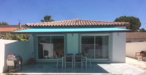 Ce store banne sur mesure de 6 x 3,5 m a été configuré avec une turquoise et un iO. Grâce à l'émission radio, il est manoeuvrable à partir d'une télécommande sans fil, pour une utilisation fluide.