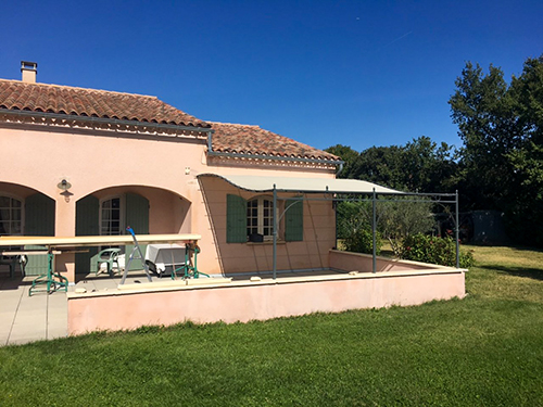 Un rentoilage de pergola a été fait sur la structure en fer forgé pour s'accorder avec les stores neufs et apporter un véritable lifting à l'esthétique de cette belle villa à Nîmes.