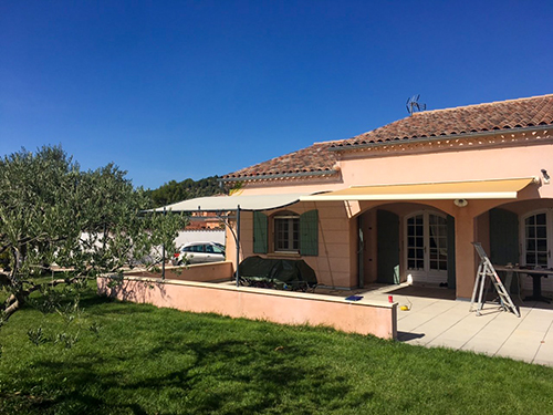 Les propriétaires de cette villa ont choisi de faire appel à nos experts poseurs de stores pour couvrir toute la surface de leur terrasse plein sud. Avec deux stores coffre intégral ivoire, un espace de vie a pu être créé à l'extérieur. De 4500 x 3000 mm chacun, ces stores à coffre offrent une technologie dernier cri avec leur , leur toile et leur système de tension des bras par sangles.