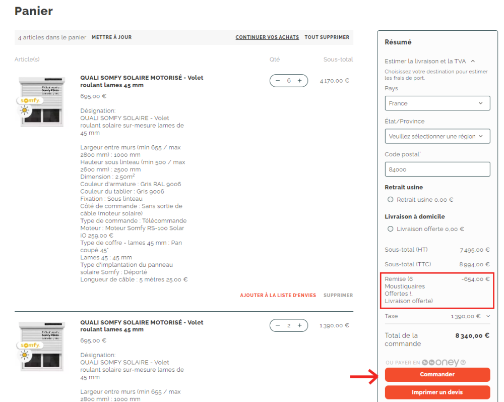 - Validez d'abord votre commande avec le nombre de moustiquaires qui correspondent à l'offre : 1 pour 2 volets achetés, 2 dès 4 volets achetés, 3 dès 6 volets, 4 dès 8 volets, 5 dès 10 volets et 6 dès 12 volets.