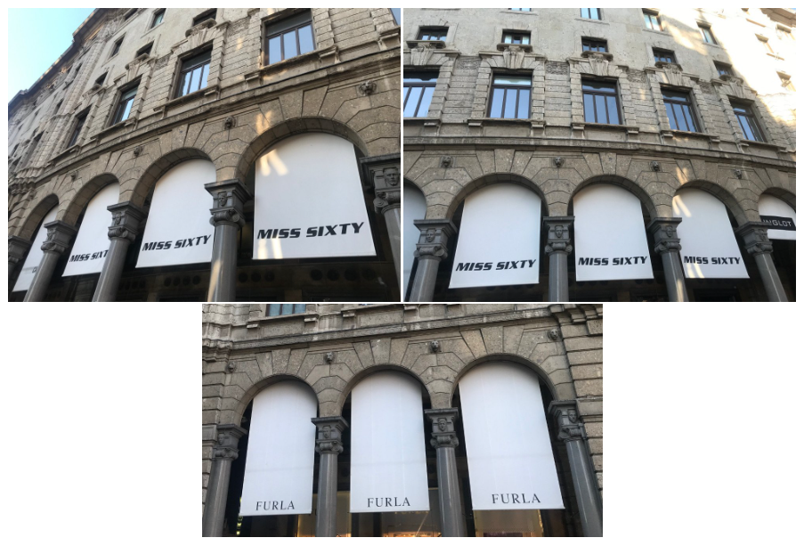 Exemple de stores verticaux installés sur des arches pour un commerce