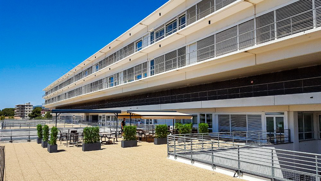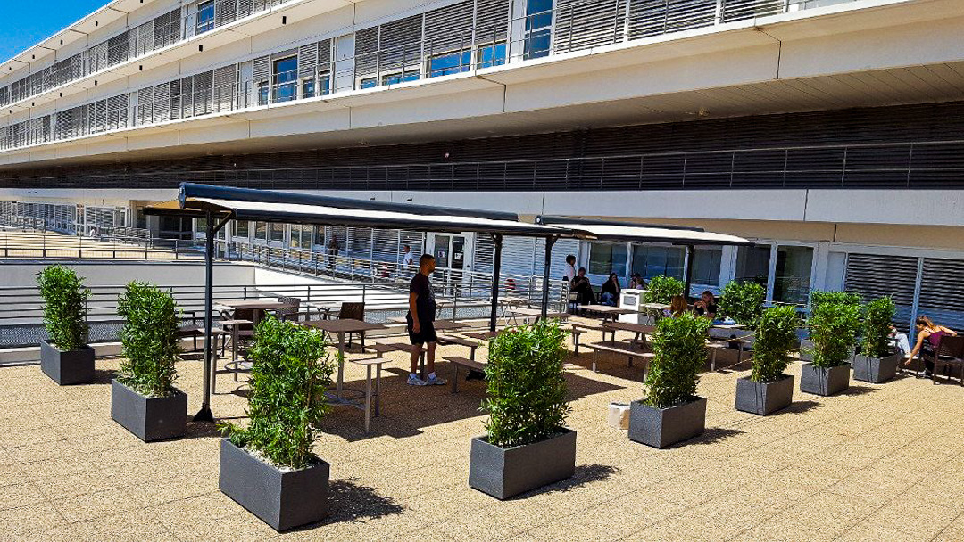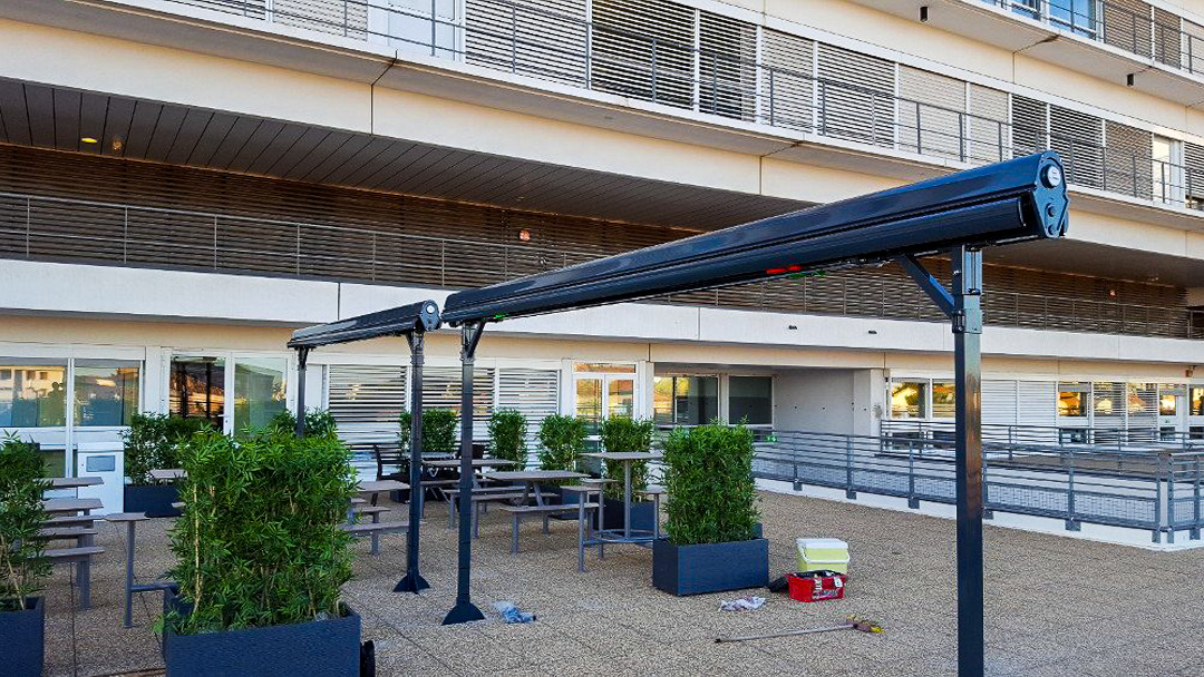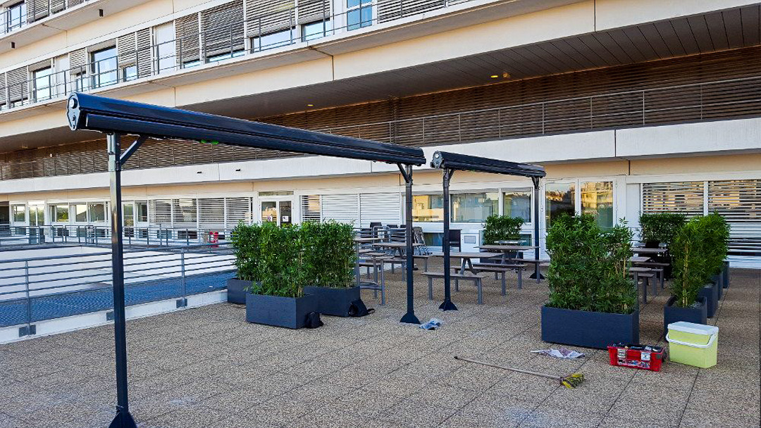 Les hôpitaux demandent des normes strictes pour l'installation de stores extérieurs. Dans la ville de Toulon, un agrandissement de la zone de service de la cafétéria sur l'une des terrasses a été prévu et dans le projet, deux stores double-pente ont été choisis pour venir délimiter cet espace.